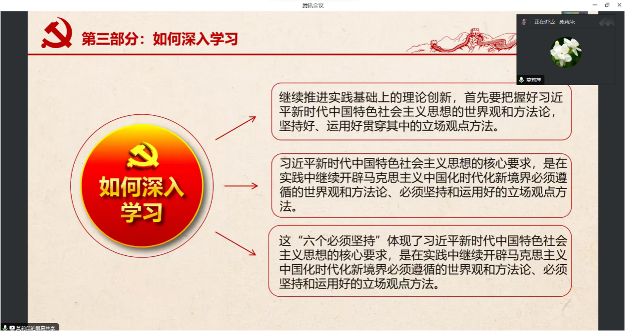 最后,支部书记莫莉萍进行总结,她强调党支部应通过学习习近平新时代中国特色社会主义思想,以学铸魂,以学增智,以学正风,以学促干,加强自身建设,充分发挥模范带头作用。