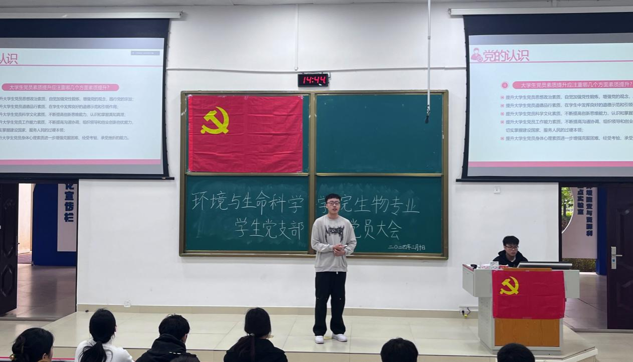 生物专业学生党支部于3月10日在武鸣校区地海楼B109教室召开专题会议。本次会议采取线上线下相结合的方式,参会人员为生物专业学生党支部全体党员、2020级拟发展对象。