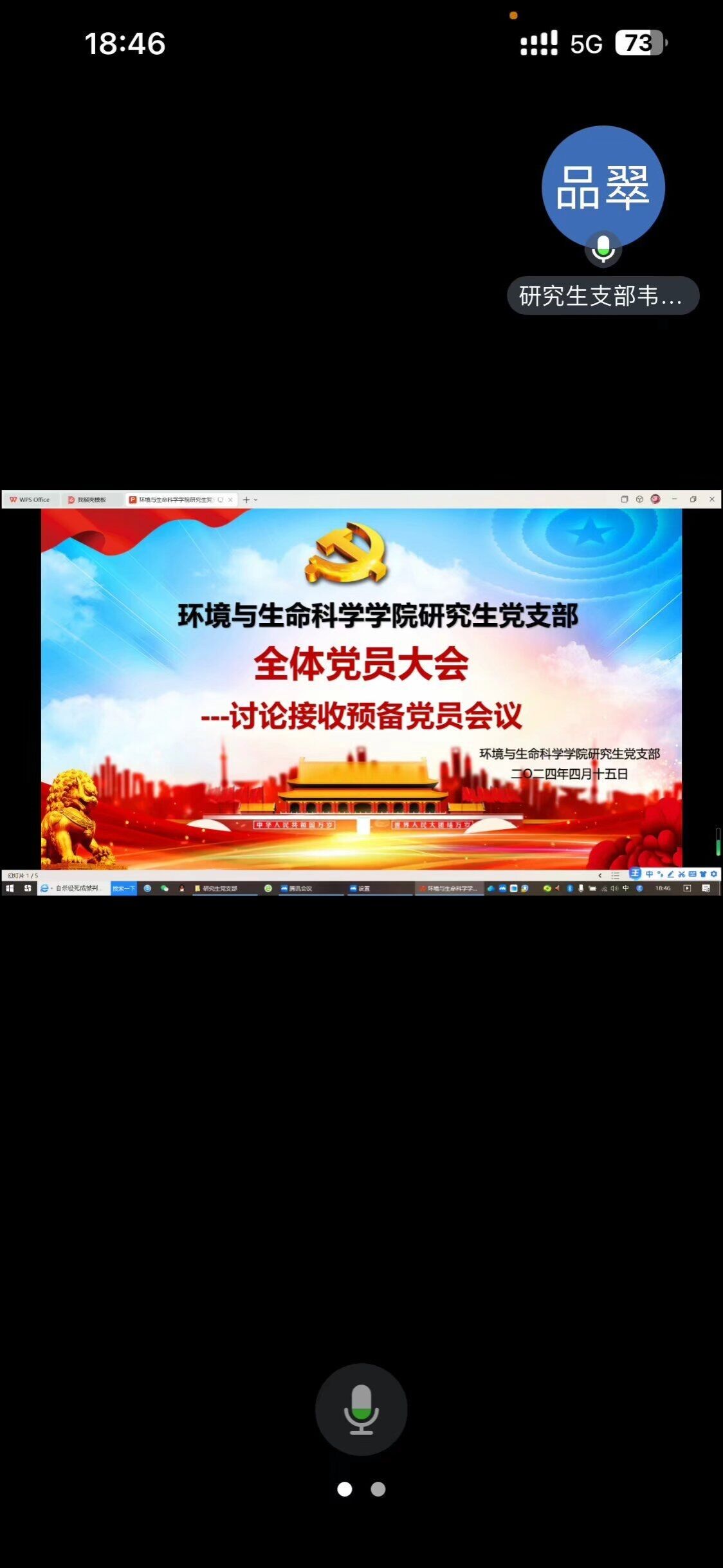 研究生党支部于2024年4月15日晚上19:30通过腾讯会议召开预备党员接收会议。本次会议主要议题是讨论陶赛军、陈媛媛2名发展对象接收为预备党员的问题,参会人员有动漫18