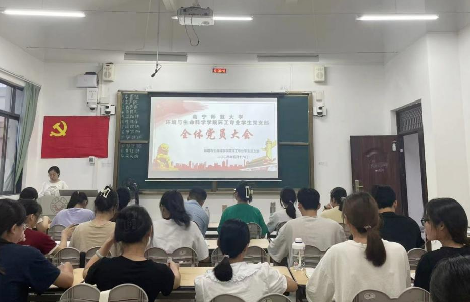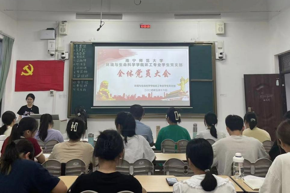 环工专业学生党支部于5月16日晚在武鸣校区1号教学楼411教室召开全体党员大会。会议主要议题是讨论12名发展对象接收为预备党员的问题,与会人员有动漫18