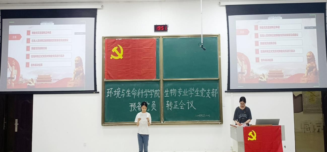 生物专业学生党支部于2024年5月21日在地源楼B107教室召开预备党员转正会议,参会人员有动漫18