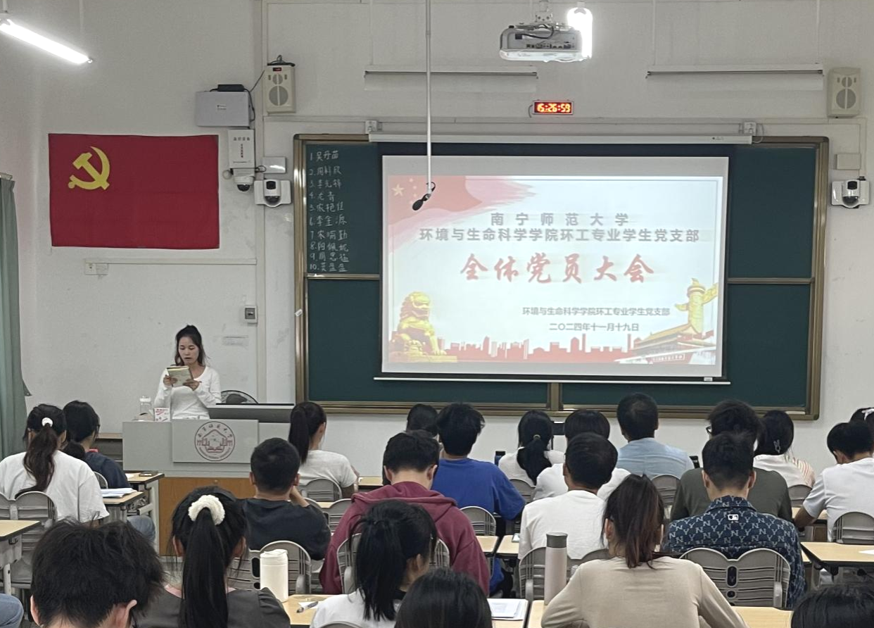 环工专业学生党支部于2024年11月19日下午在武鸣校区1号教学楼120教室召开全体党员大会。会议主要议题是讨论吴丹苗等10名预备党员转为正式党员的问题,参会人员有动漫18