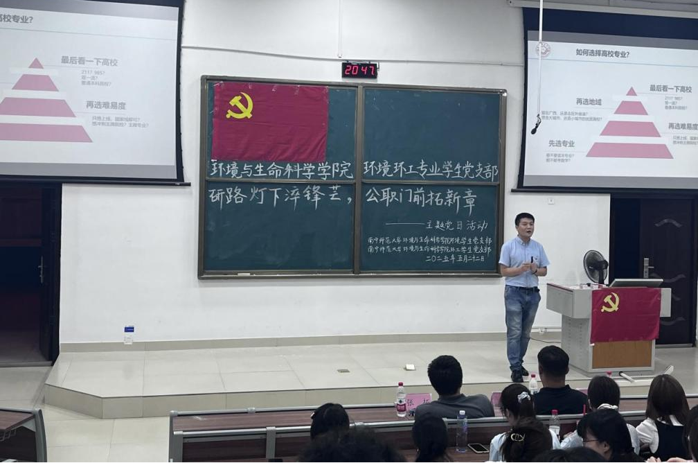环境与环工专业学生党支部于5月22日晚在地海楼B109教室开展“研路灯下淬锋芒,公考路上谱新章”主题党日活动。与会人员有学院党委专职组织员兼环工专业学生党支部书记普胤杰、环境专业学生党支部书记张拓、党员教师曲炳鹏及环境科学专业与环境工程专业2021级、2022级及2023级部分学生。
