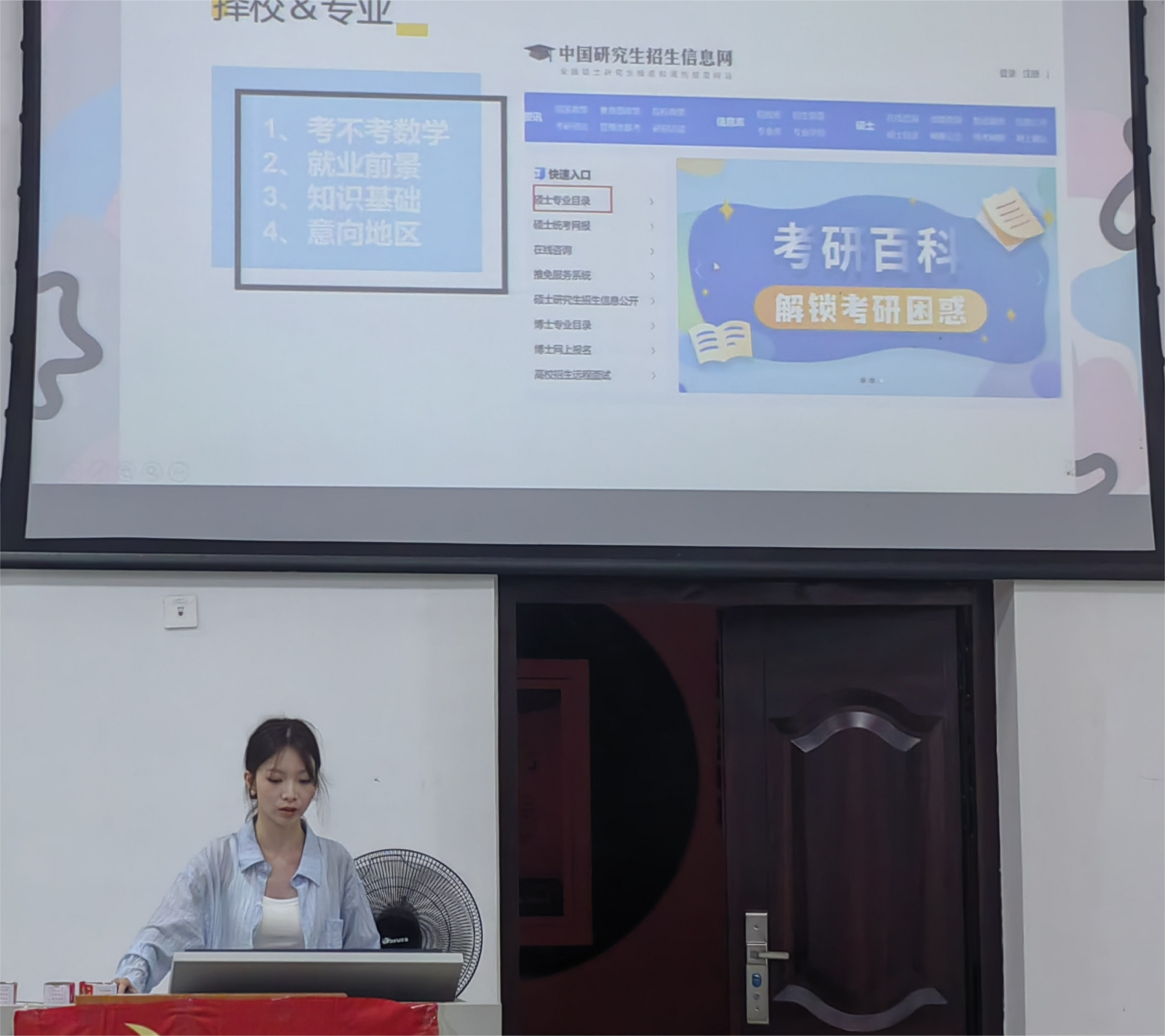 随后,曲炳鹏老师讲解了与专业相关的考研方向,分析了各个考研方向研究重点、发展趋势及社会需求契合度。同时,他介绍了2025年考研成绩优异的同学,并邀请他们分享经验。
