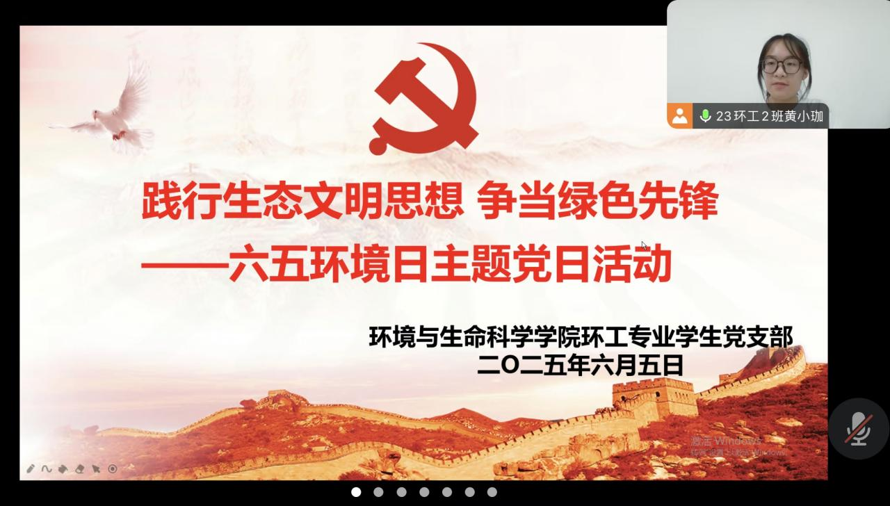 环工专业学生党支部于6月5日在线上举办“践行生态文明思想,争当绿色先锋”主题党日活动,支部全体党员参会。