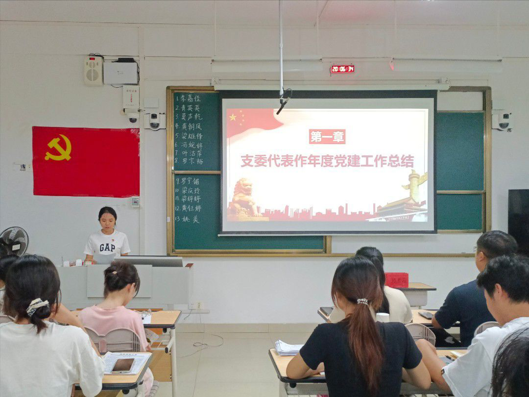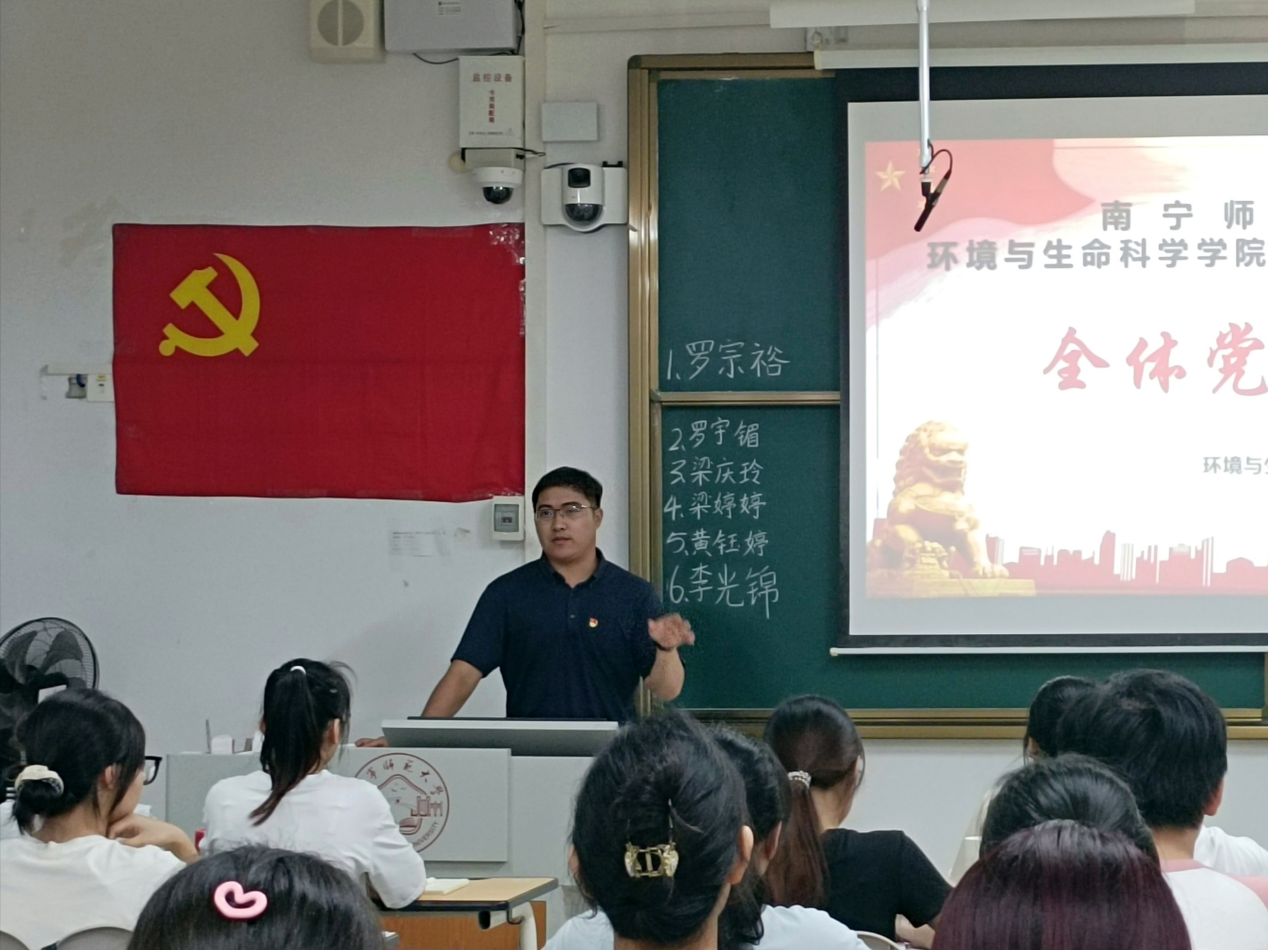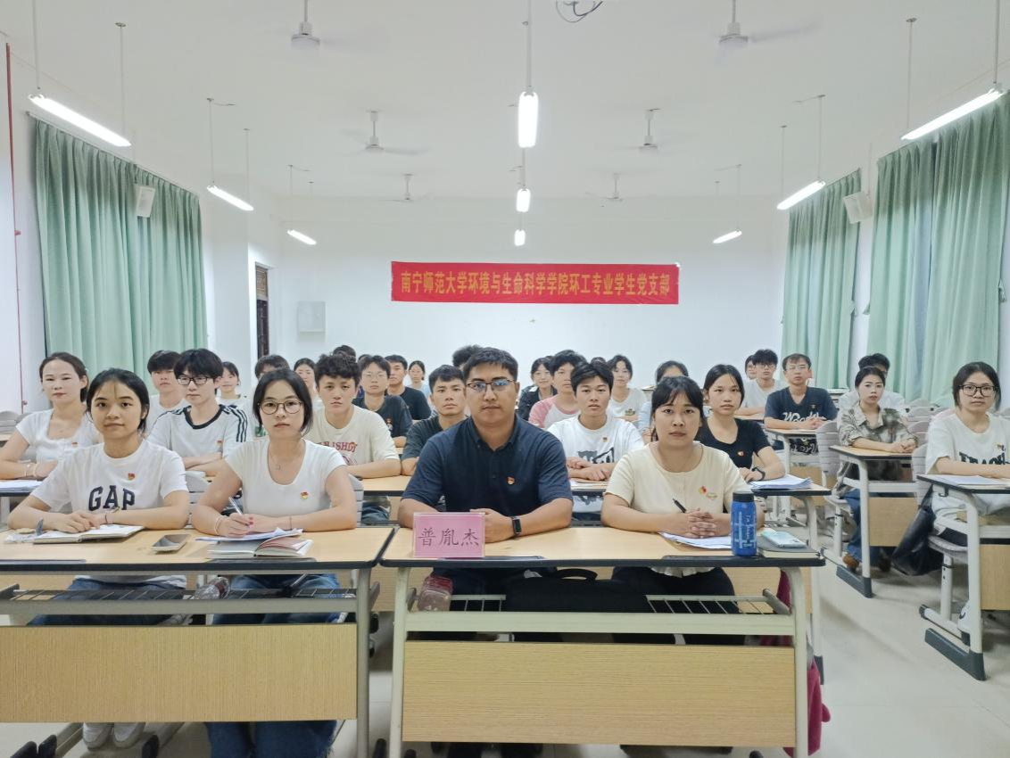 环工专业学生党支部在武鸣校区1号教学楼220教室召开党员大会,主要议题是总结支部工作,增补支部委员,支部书记普胤杰及全体党员参会。