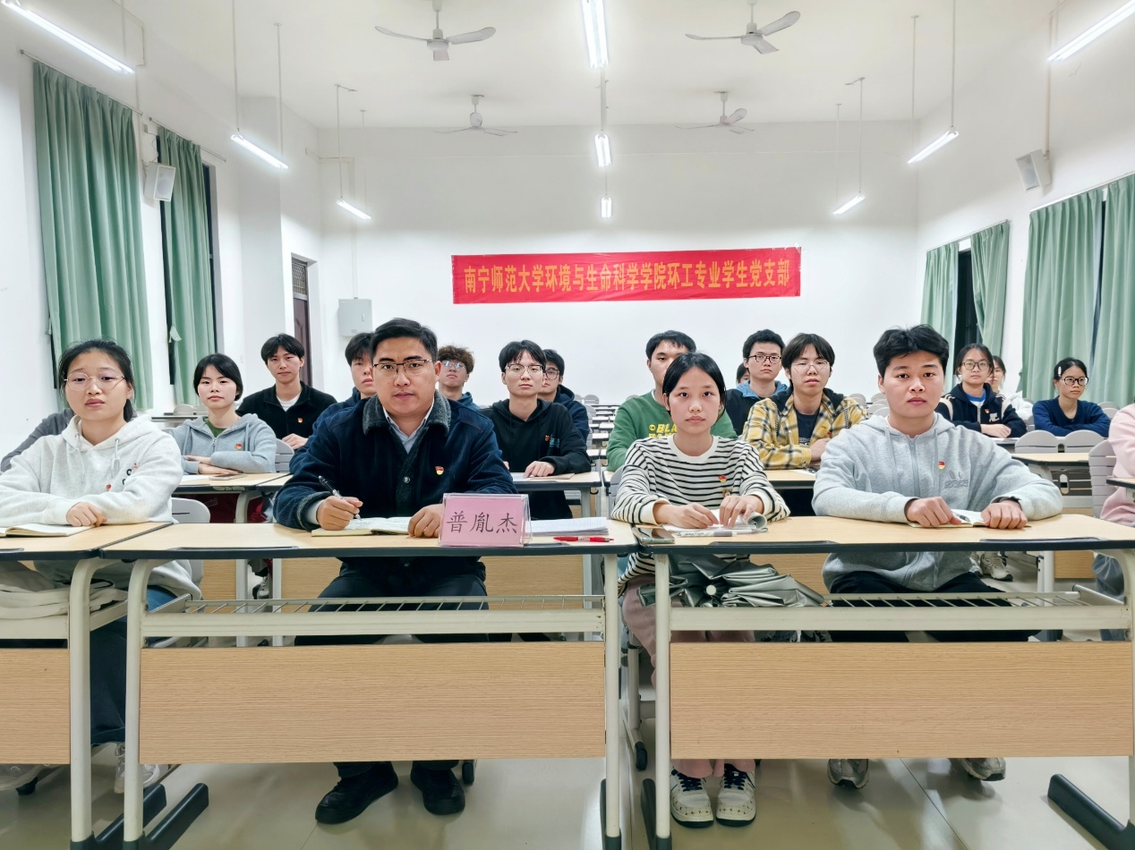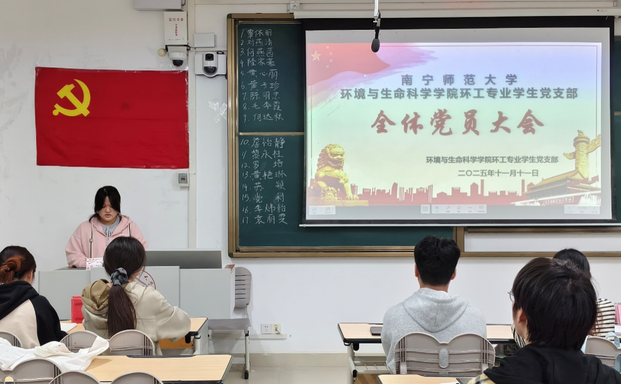 环工专业学生党支部在武鸣校区1号教学楼118教室召开全体党员大会。党支部书记普胤杰及全体党员参会,会议聚焦覃依明等17名拟发展对象的确定议题。