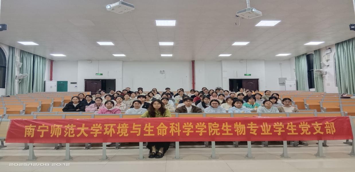 生物专业学生党支部于2025年12月8日下午在武鸣校区1号教学楼214教室召开预备党员接收会议。本次会议采取线上线下相结合的方式,会议主要议题是讨论黄春婷等27名发展对象接收为预备党员的事宜。会议由党支部书记刘雅楠主持,全体党员及发展对象参与。