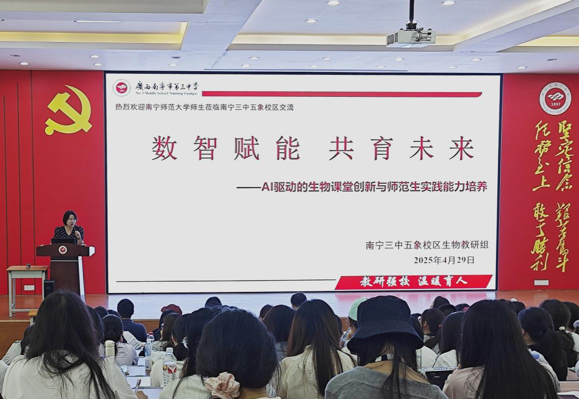 2025年4月29日,动漫18 2023级生物科学专业师范生在何英姿院长、李鹏老师和陈梅兰老师的带领下前往南宁市第三中学五象校区开展了教育见习。南宁三中魏述涛副校长及生物组老师参加指导。此次活动包括初中和高中生物展示课观摩以及“AI + 教育”主题讲座,为同学们带来了全新的教学体验与深刻启发。