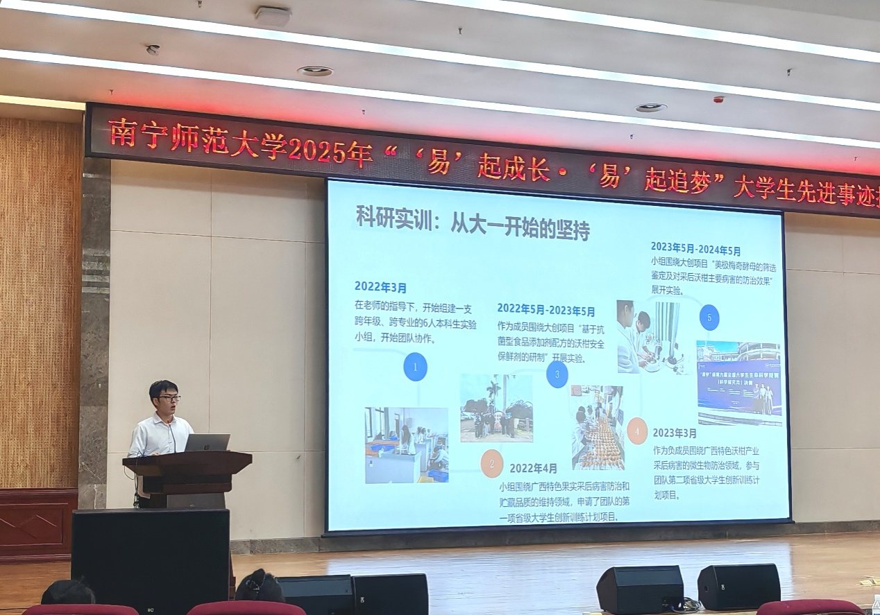 5月23日下午,动漫18 2021级生物科学2班学生代表蒋琳华在武鸣校区图书馆报告厅参加“‘易’起成长,‘易’起追梦”大学生先进事迹报告会,并作主题分享。