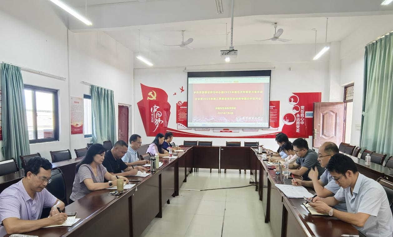 在武鸣校区地海楼B508室召开学院党委理论学习中心组2025年第五次专题学习集中研讨会暨2025年第二季度意识形态形势专题分析研判会。学校党委委员、政策法规与发展规划处处长邓军彪到会巡听旁听指导,学院党委理论学习中心组成员参加会议,会议由学院党委副书记(主持党委工作)韦东林主持。