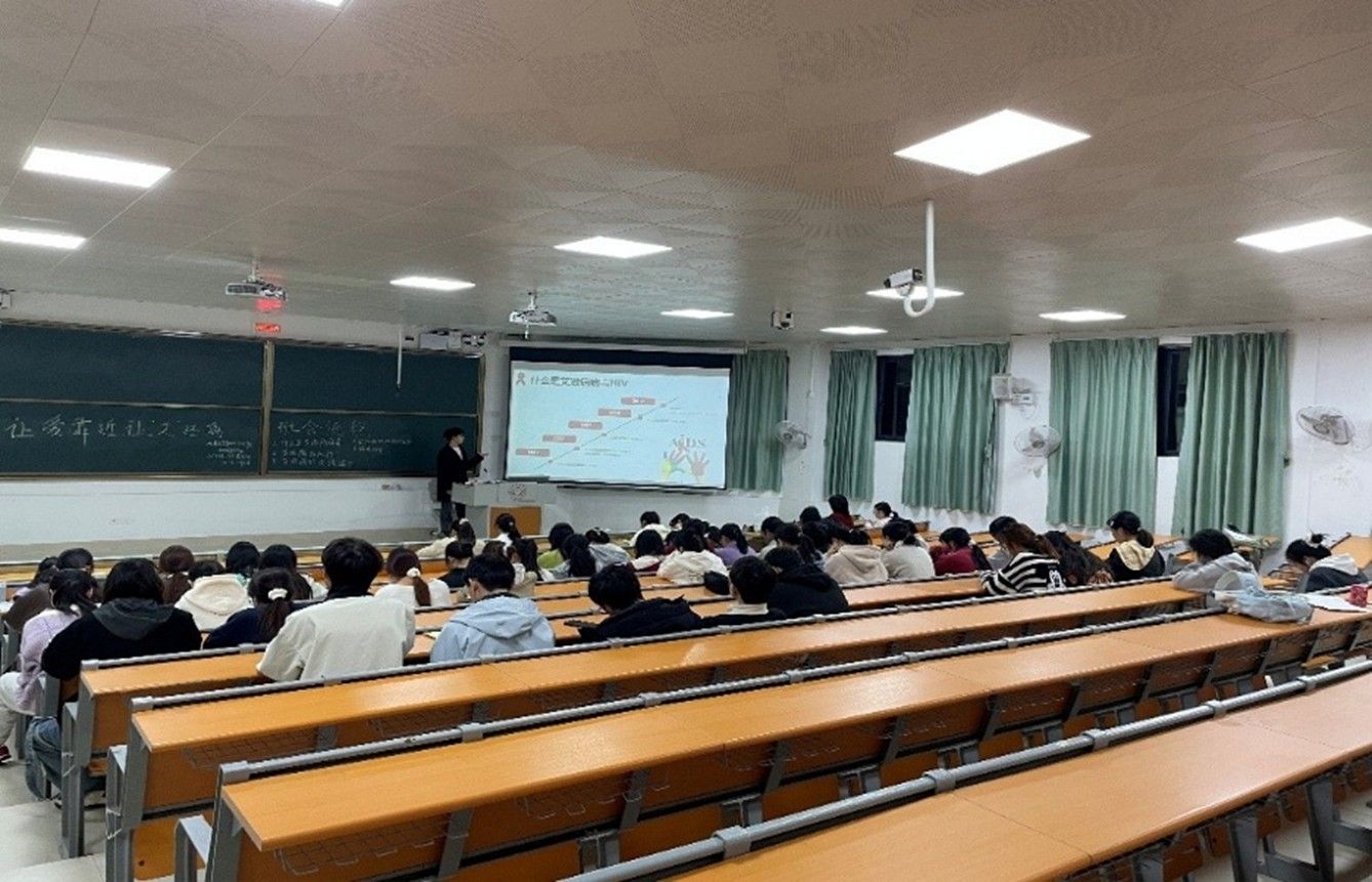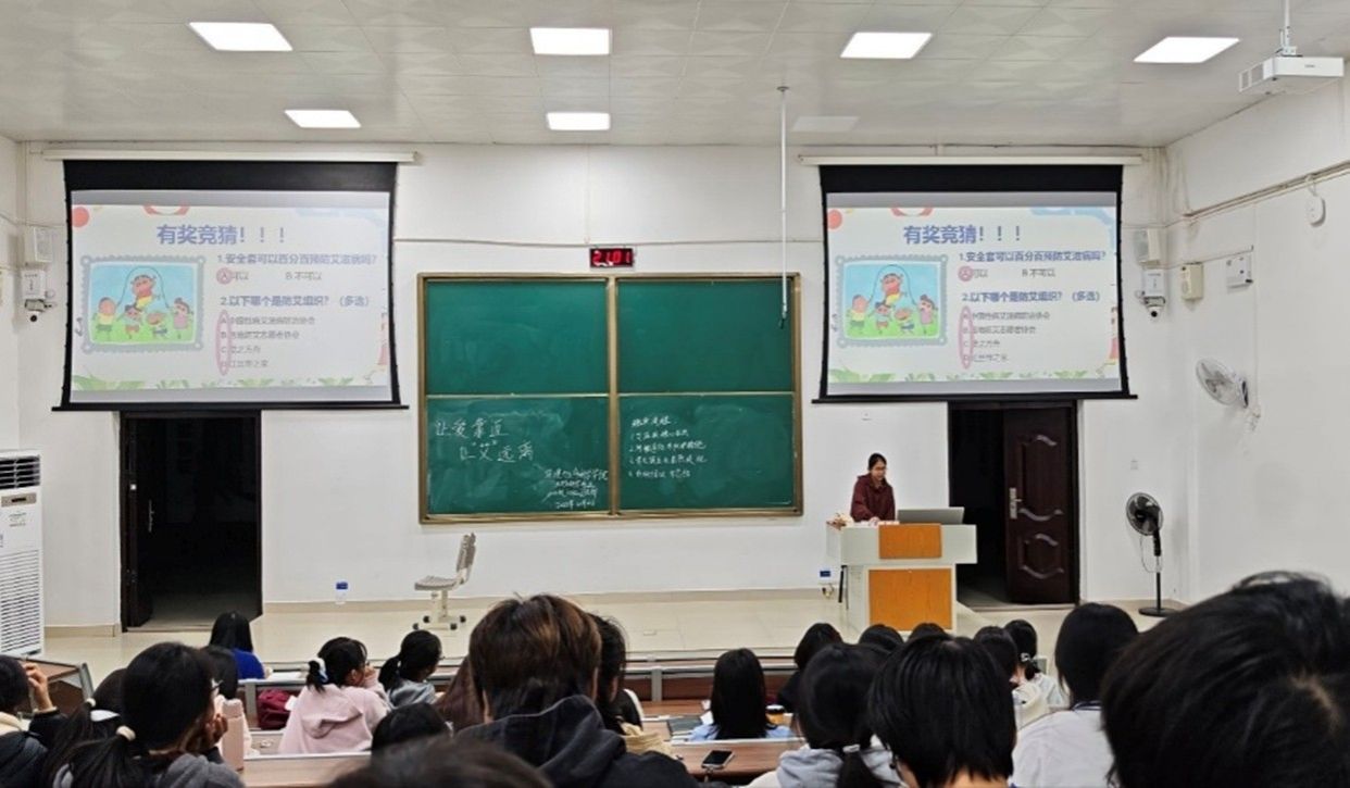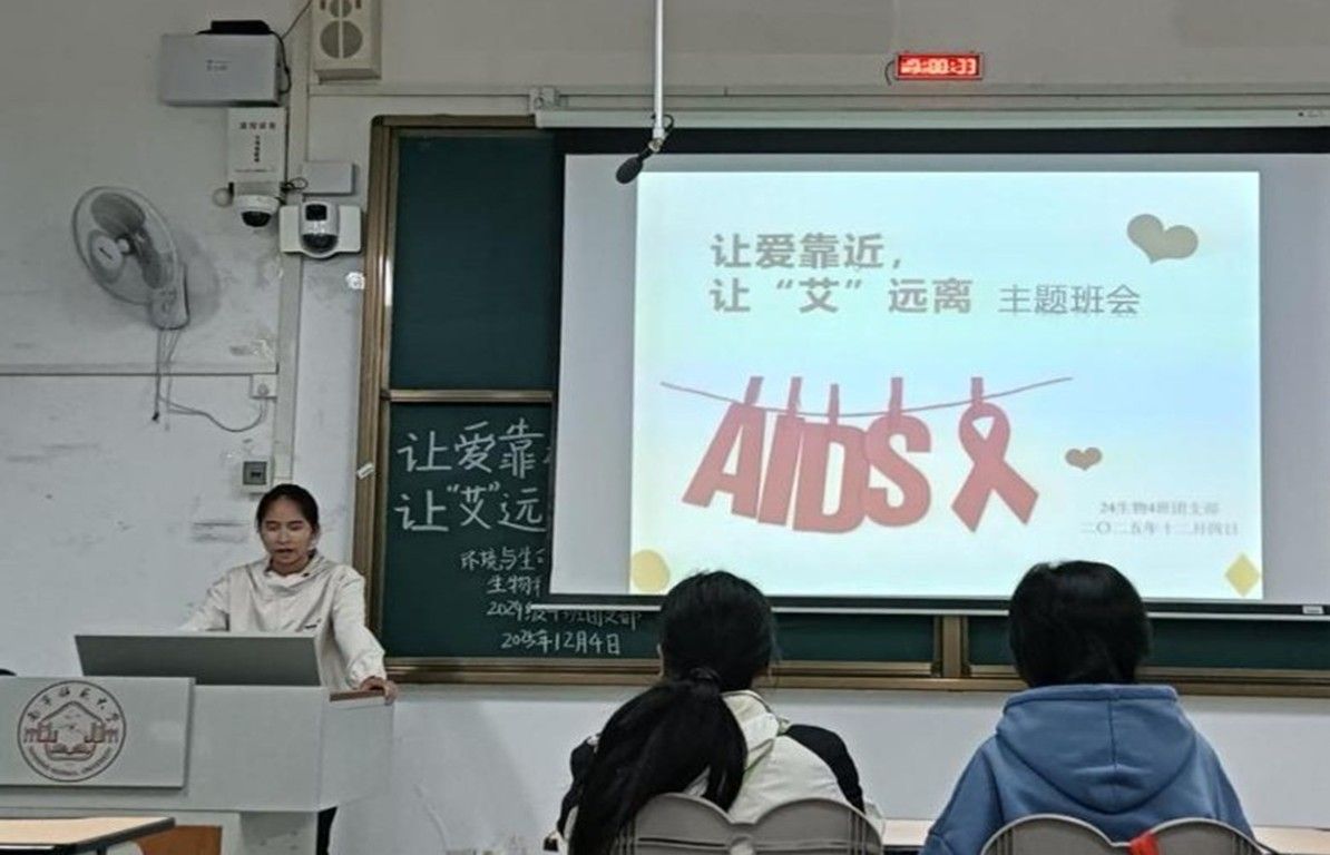班会围绕艾滋病基础知识、三大传播途径(性接触、血液、母婴)、预防措施及国家“四免一关怀”政策展开。主持人通过讲解案例和播放公益短片的方法,向同学们科普了72小时内暴露后阻断和免费检测渠道等实用信息,澄清了“日常接触不会传染”等误区。部分班级创新班会形式,打造趣味化的知识普及阵地。例如23级生物1班,便巧妙将“数字炸弹”游戏与生物知识问答相融合,设计出互动竞答环节。这种寓教于乐的方式极大激发了大家的参与热情,最终答题正确率高达95%,不仅让同生们扎实掌握了相关健康知识,更让班会的知识传播效率得到显著提升。