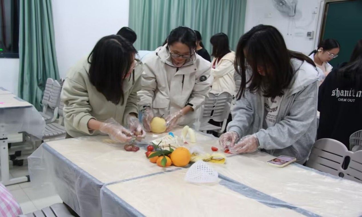 当晚,学院在武鸣校区1号教学楼115教室举办健康科普讲座,围绕蛋白质、铁、维生素D等营养物质补充及饮食、运动、保暖结合的过冬方案展开,现场氛围热烈,同学们收获颇丰。讲座结束后,“创意暖冬”水果拼盘活动随即开展。近二十组同学分工协作创作,以实践践行所学,实现学用结合。