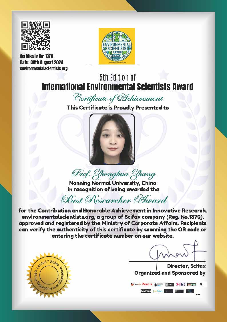 张忠华教授荣获第五届国际环境科学家奖(International Environmental Scientist Award)。该奖由国际学术组织ScienceFather授予。ScienceFather是国际知名的科学、工程和同行评审出版商和会议组织者Scifax公司旗下的一个团体。此奖基于科研工作者的学术表现以及最新发表论文的创新性,授予在学术研究方面取得贡献的学者。据悉,近年来,已有来自University of Pittsburgh、Tulane University、中国科学院、浙江大学、上海交通大学、南开大学、四川大学、广西师范大学等国内外高校或科研机构的学者获该国际学术组织颁发的奖项。