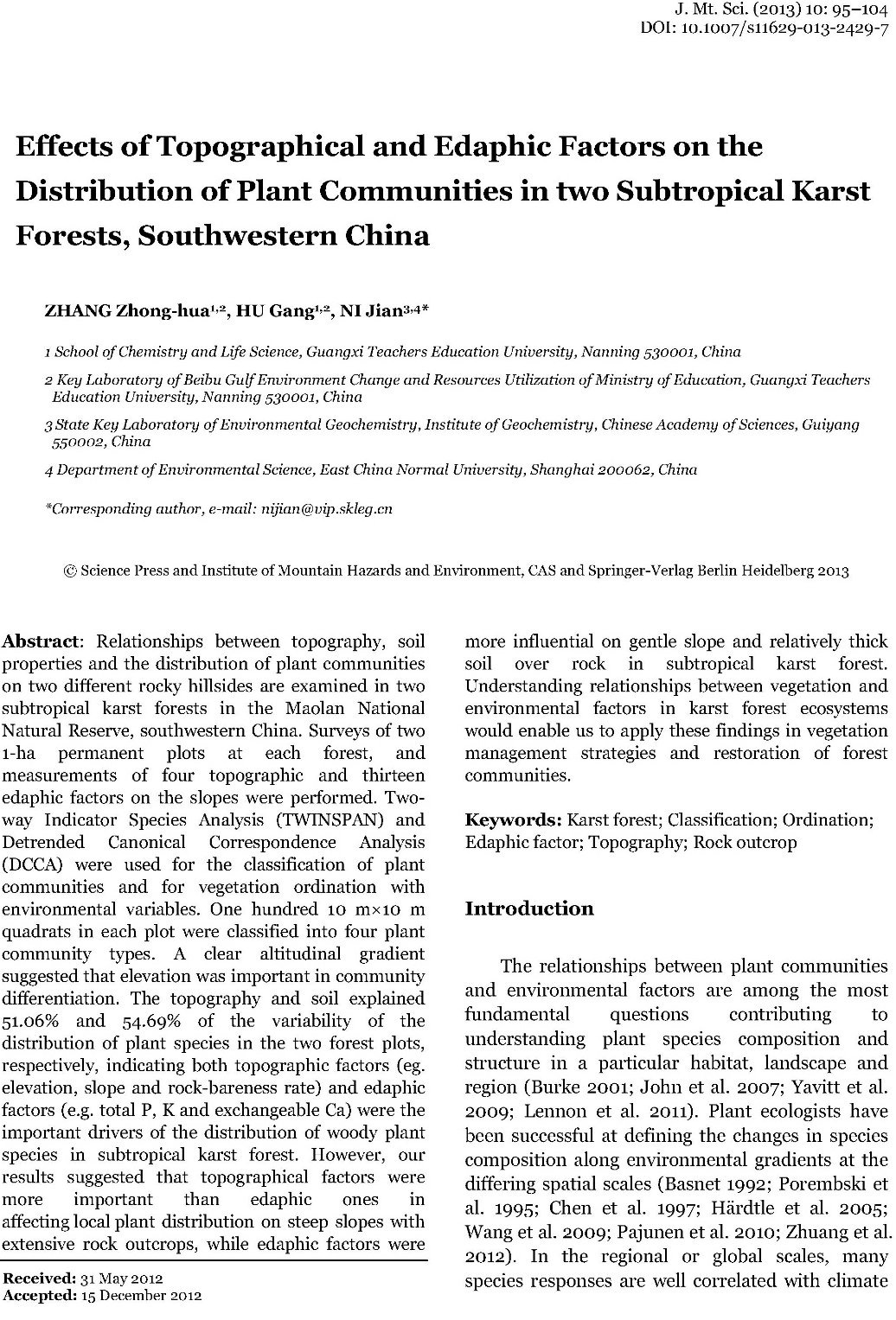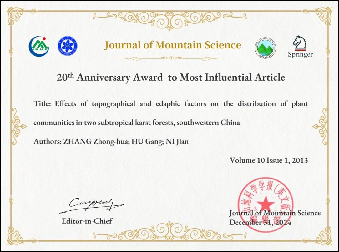 张忠华教授发表的论文(Zhang ZH, Hu G, Ni J. Effects of topographical and edaphic factors on the distribution of plant communities in two subtropical karst forests, southwestern China. Journal of Mountain Science, 2013, 10(1): 95-104.)荣获该期刊创刊20周年最具影响力论文荣誉称号。动漫18