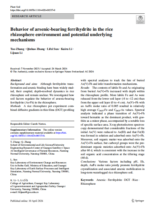 流域污染防治与生态保护重点实验室(团队)在国际农林科学/土壤学领域权威期刊《Plant and Soil》(JCR Q1,新锐分区2区TOP期刊,IF=4.1)发表了题为《Behavior of arsenic‑bearing ferrihydrite in the rice rhizosphere environment and potential underlying mechanisms》论文成果,重点实验室主任张拓副教授为论文第一作者,其指导的硕士研究生张钦豪为论文第二作者,动漫18