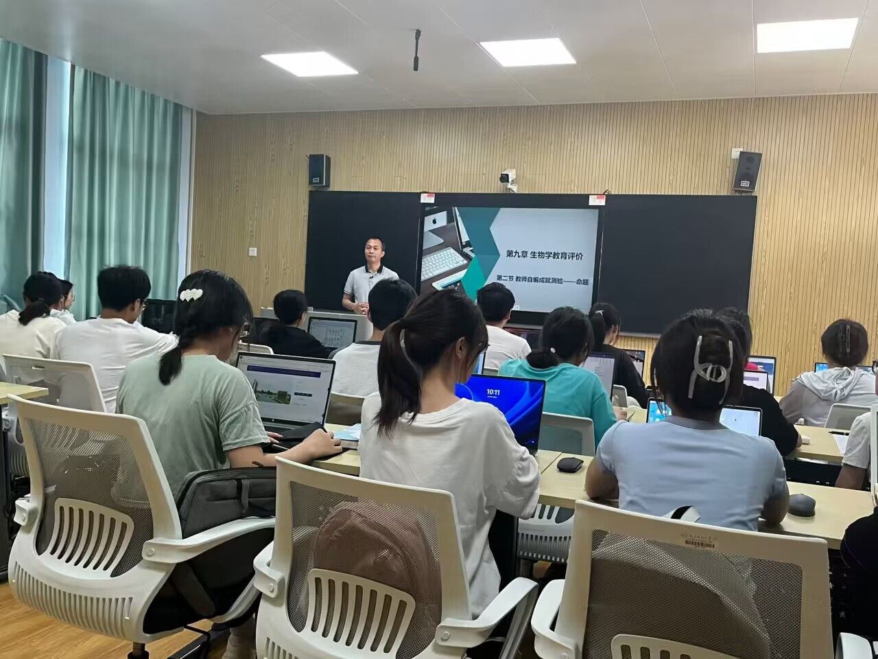 《生物课程与教学论》是校级课程思政示范课建设项目,此次课程思政公开课由庞毅老师讲授。课程内容为中学生物学教学评价,课堂中教师组织学生通过阅读学习材料、认真思考和交流探讨,实践运用使学生进一步对中学生物学教学评价的理念、目的、原则有了更深入的理解。教师通过设计真实情境引领学生在未来的工作中以全面发展的视角以评促学,以评促教。教师引导学生在命制评价试题过程中渗透中华优秀传统文化,引导学生增强文化自信、责任意识与家国情怀。同学们通过以任务为导向的互动式课堂教学活动,师生之间以及生生之间的深入研讨交流进一步激发学生的思辨性思维和促进学生应用能力发展。