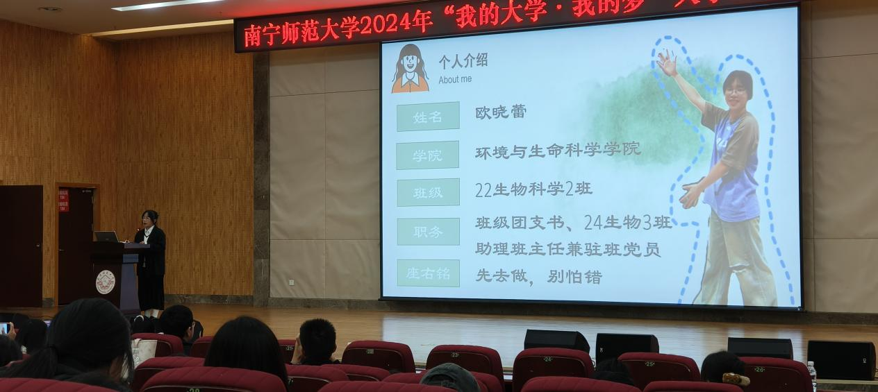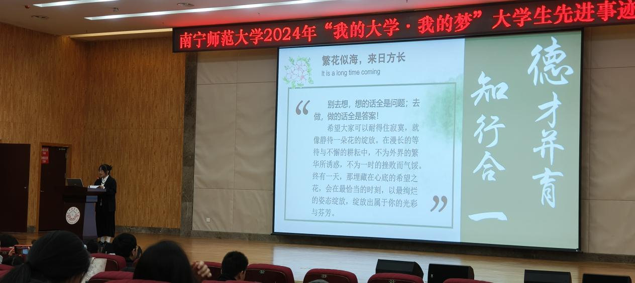 武鸣校区图书馆报告厅参加“我的大学·我的梦”大学生先进事迹报告会,并作主题分享。