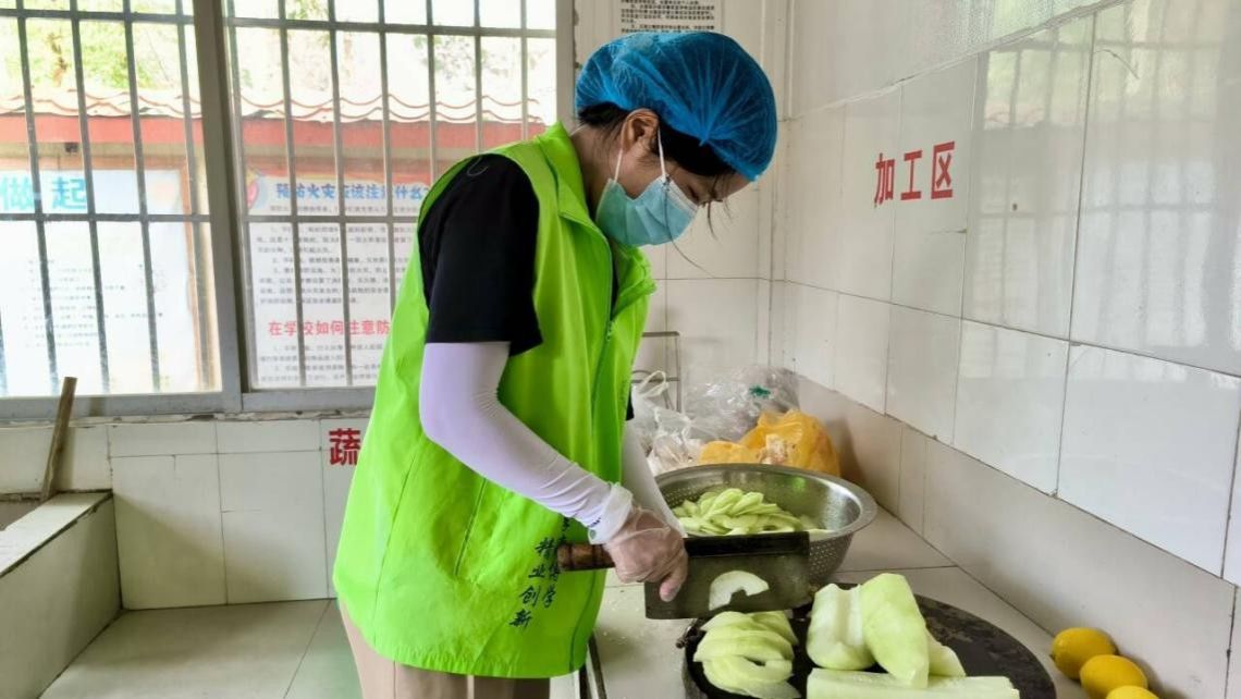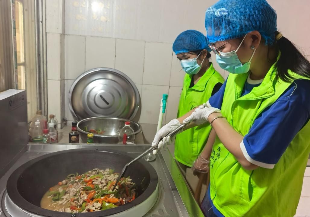 厨房里,负责洗菜的同学额角的汗珠顺着脸颊滑落,却丝毫没有影响手中的动作;切菜的同学低着头,汗水浸湿了后背的衣服,紧紧贴在身上,手里的刀始终不停,将土豆丝和冬瓜块切得均匀整齐;掌勺的同学站在灶台前,紧盯锅中的饭菜,不时翻动锅铲。