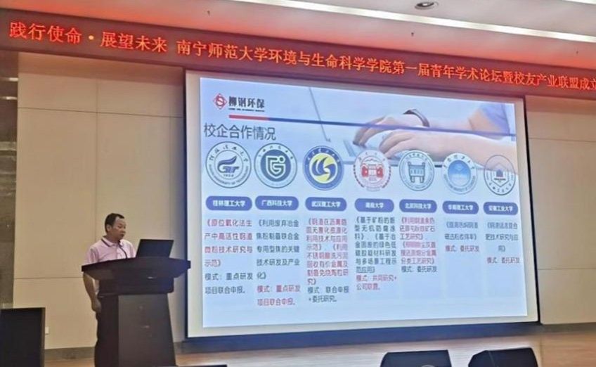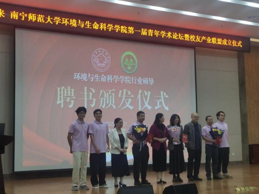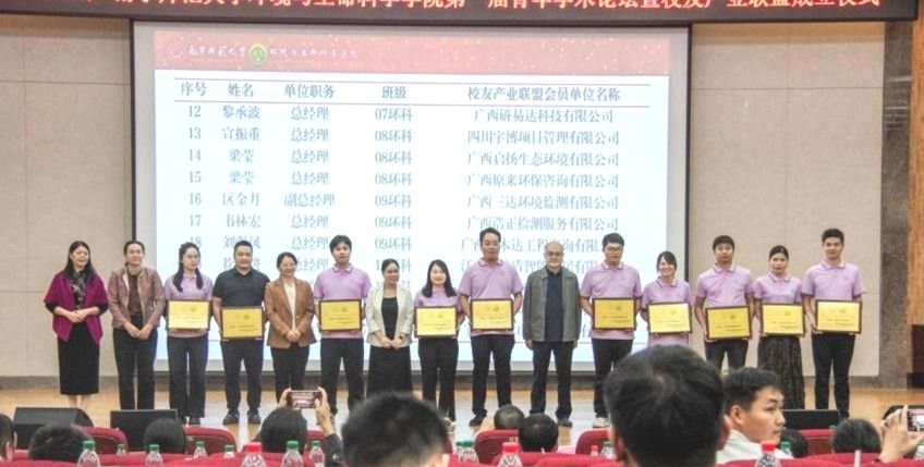 产业联盟成立了,总共有22家校友公司成为了产业联盟会员单位。参会领导们为首批22家产业联盟会员单位代表进行授牌仪式。同时为加强校企协同育人,学院特聘请三位在业界具有重要影响力的杰出校友担任资源与环境专业硕士生导师,分别是广西柳州钢铁环保有限公司总经理龙顺红,广西环境保护科学研究院大气环境研究中心副主任(主持工作)毛敬英博士,广西博环环境咨询服务有限公司副总经理张荣海博士。大会为三位硕导颁发了聘书。