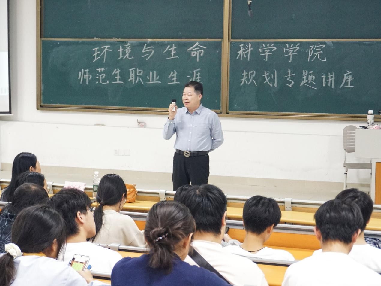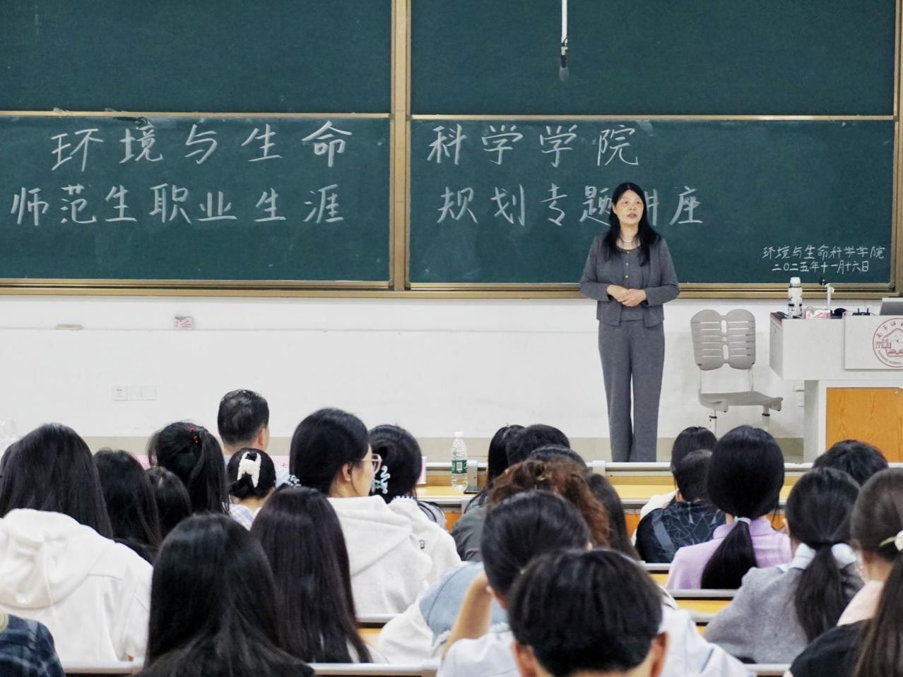 为助力同学们明确职业发展方向,科学规划学业与职业生涯,动漫18 于11月16日下午在武鸣校区1号教学楼115教室举行师范生职业生涯规划专题讲座。动漫18 院长何英姿主持活动,正高级教师陈振友应邀担任主讲,辅导员甘佩萍和2025级生物科学专业的同学到场聆听。