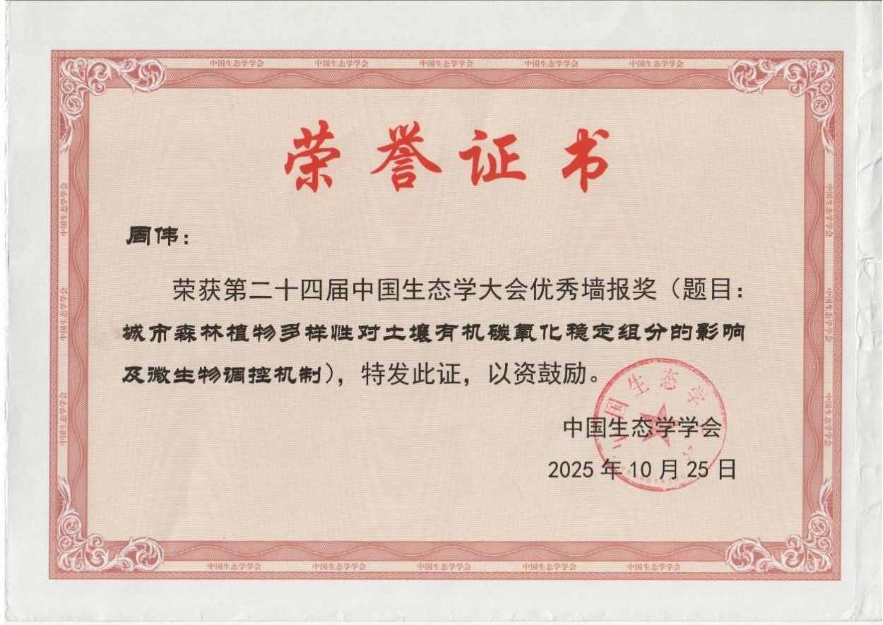 两位同学分别依托立项的国家级、自治区级大学生创新创业训练计划项目,在周伟老师的悉心指导下,围绕城市森林土壤固碳功能及其微生物驱动机制这一前沿主题,完成了从实验设计到数据分析的科研训练,取得初步创新成果。此次获奖既是对学生个人科研潜力与专业素养的肯定,也彰显了动漫18