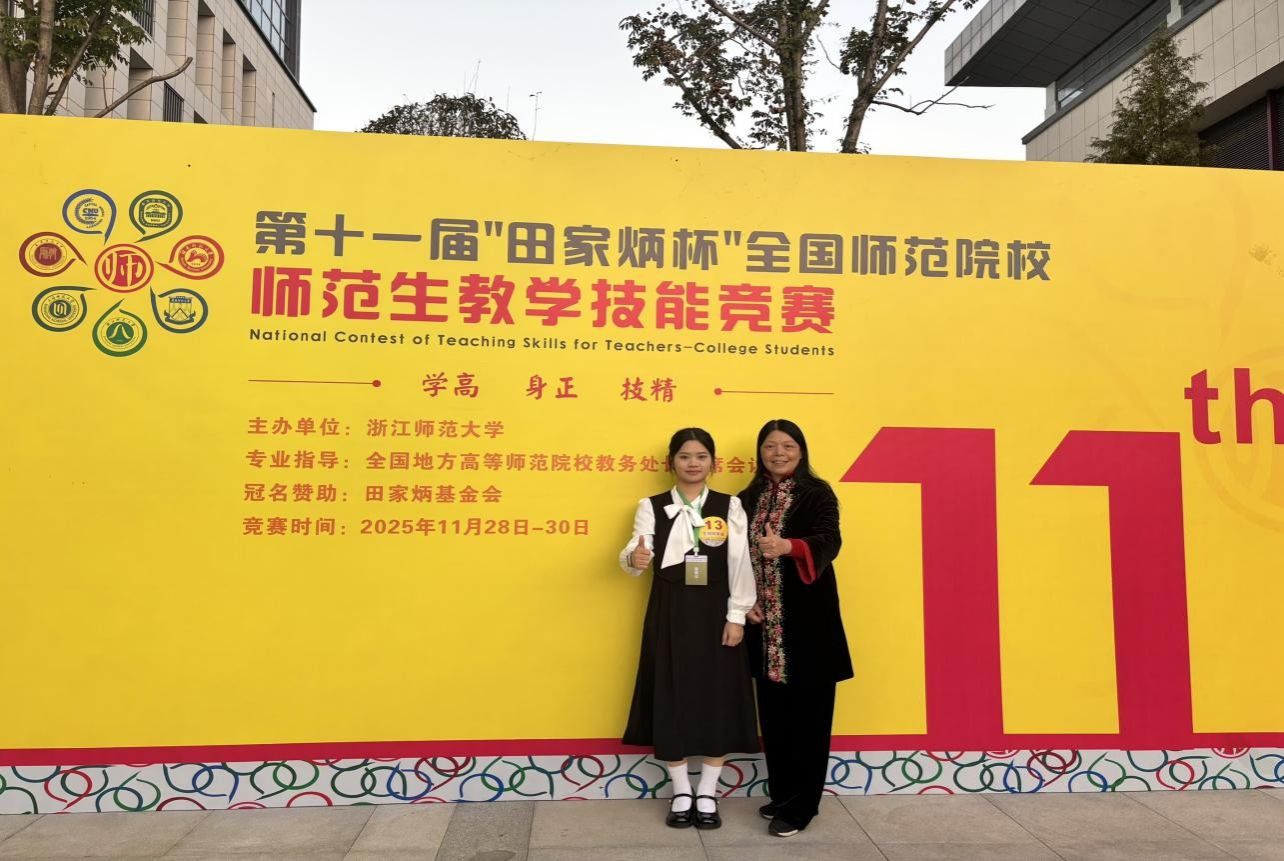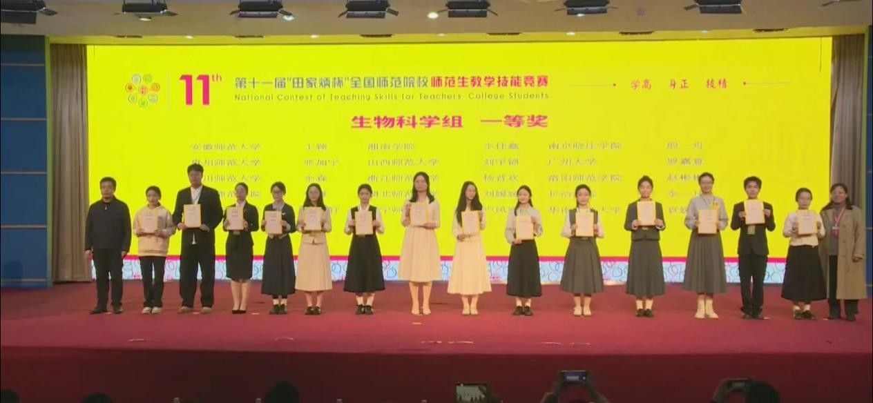 生物科学专业卢凤娜同学在指导老师何英姿、庞毅、李鹏的悉心指导下,历经教学设计、即席讲演、模拟授课等多个环节的激烈比拼,凭借扎实的生物学专业功底与生动的教学呈现,荣获全国一等奖。