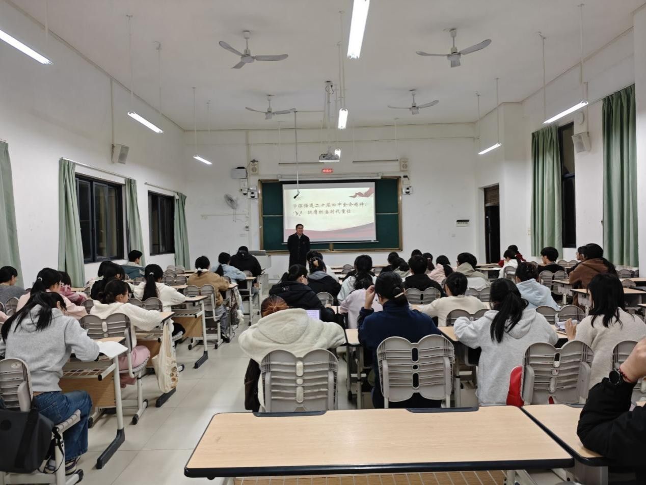 于2025年11月26日晚在武鸣校区1号教学楼120教室开展入党发展对象培训班,专题学习党的二十届四中全会精神。