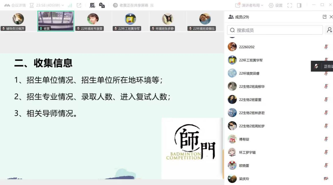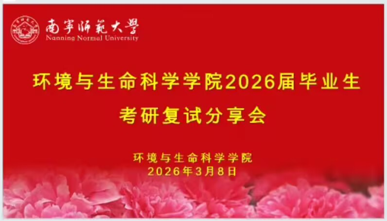 于3月8日晚通过线上会议的形式,顺利举办“2026届毕业生考研复试分享会”。参会人员有黄星群老师、学院辅导员甘佩萍以及29名考研学子。
