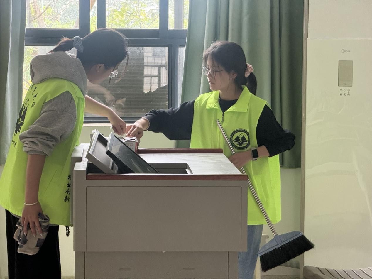 活动当天,48名志愿者分为八组,身穿志愿者服装,自带抹布、扫把等清洁工具,在工作人员带领下对武鸣校区1号、2号教学楼及其周边公共区域进行清扫。他们分工协作,其中两组志愿者俯身擦拭公共座椅的缝隙与指示牌牌面,将积尘逐一清理干净;四组志愿者走进教室,将桌椅摆放整齐,排列出对称并拢的格局;另外两组志愿者弯腰捡拾草坪里的纸屑、塑料袋等垃圾,分类装入垃圾袋后统一丢弃,不放过任何卫生死角。经过一番细致有序的清扫,校园公共环境焕然一新,充分展现了志愿者们乐于奉献、团结协作的良好精神风貌。