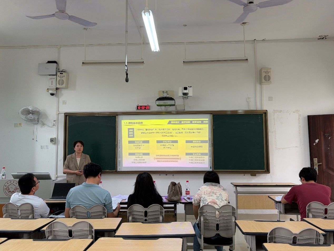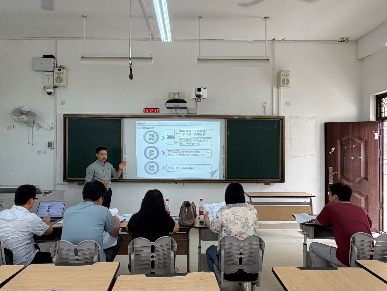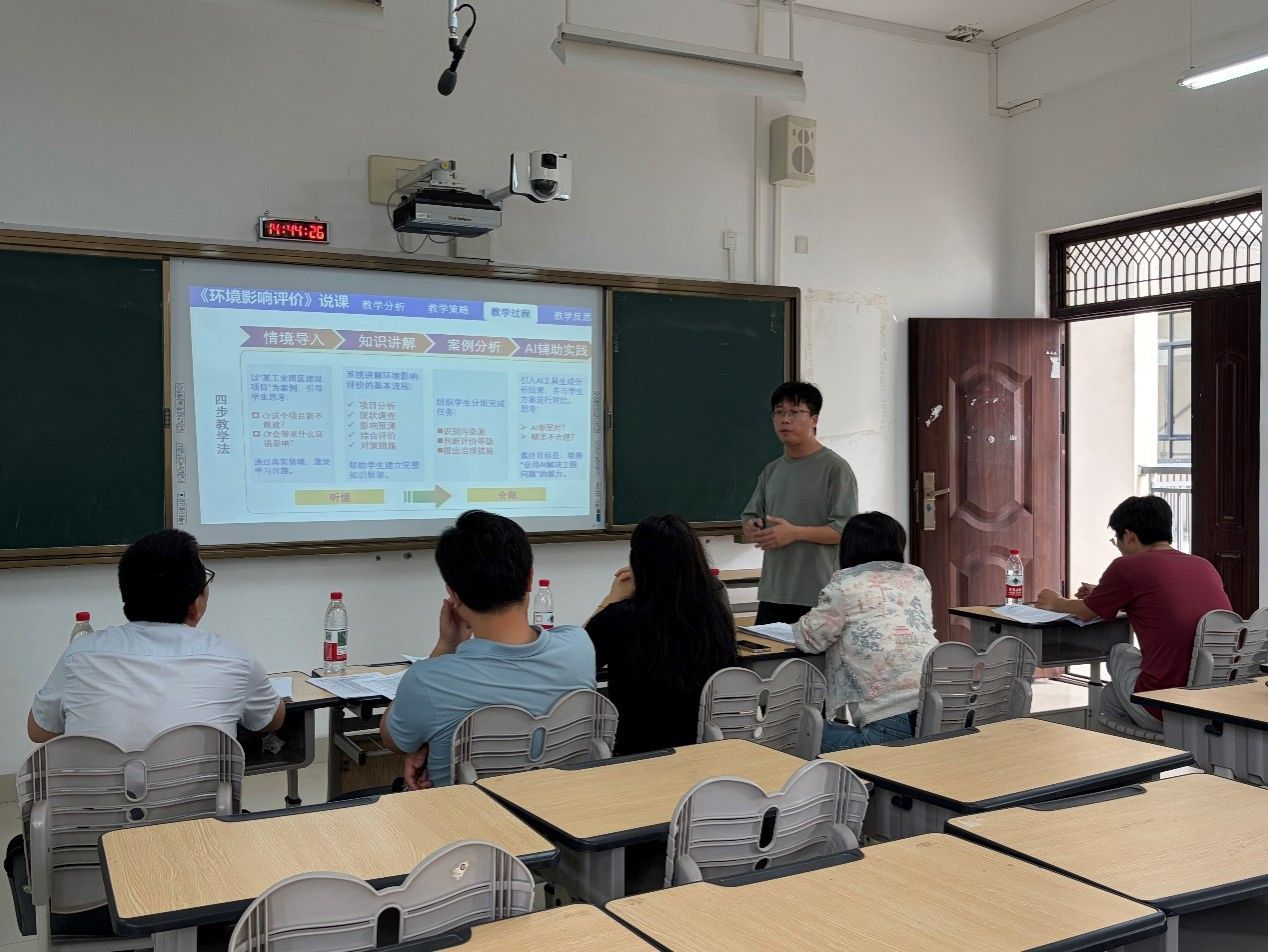 比赛中,四位教师立足各自专业课程,围绕课程目标、教学内容、教学方法、课程思政及教学评价等方面进行了精彩的说课展示。黄富老师围绕《环境影响评价》课程,系统阐述了如何结合国家环保政策与最新法规,引导学生掌握环境影响评价的基本理论与实际应用能力,突出课程的实践性与时代性。容群老师在《环境监测》课程展示中,强调理论与实践相结合,重点介绍了实验教学环节的设计思路,注重培养学生严谨求实的科学态度和数据分析能力。张拓老师则以《固体废物处理与处置》课程为例,分享了在“双碳”背景下,如何将固废资源化、减量化、无害化理念融入教学全过程,激发学生服务生态文明建设的责任感。张越老师在《水污染控制工程》课程中,围绕典型水处理工艺流程,展示了案例教学与工程实践相结合的教学模式,着力提升学生的工程素养与创新能力。