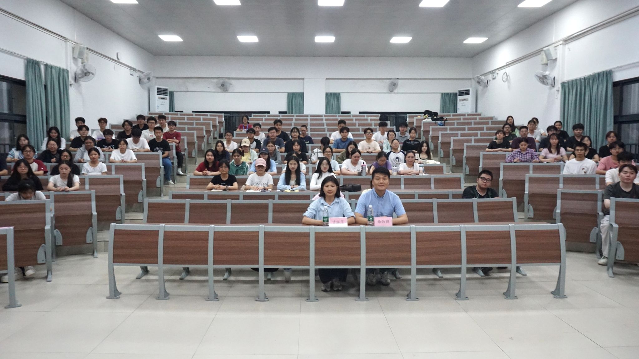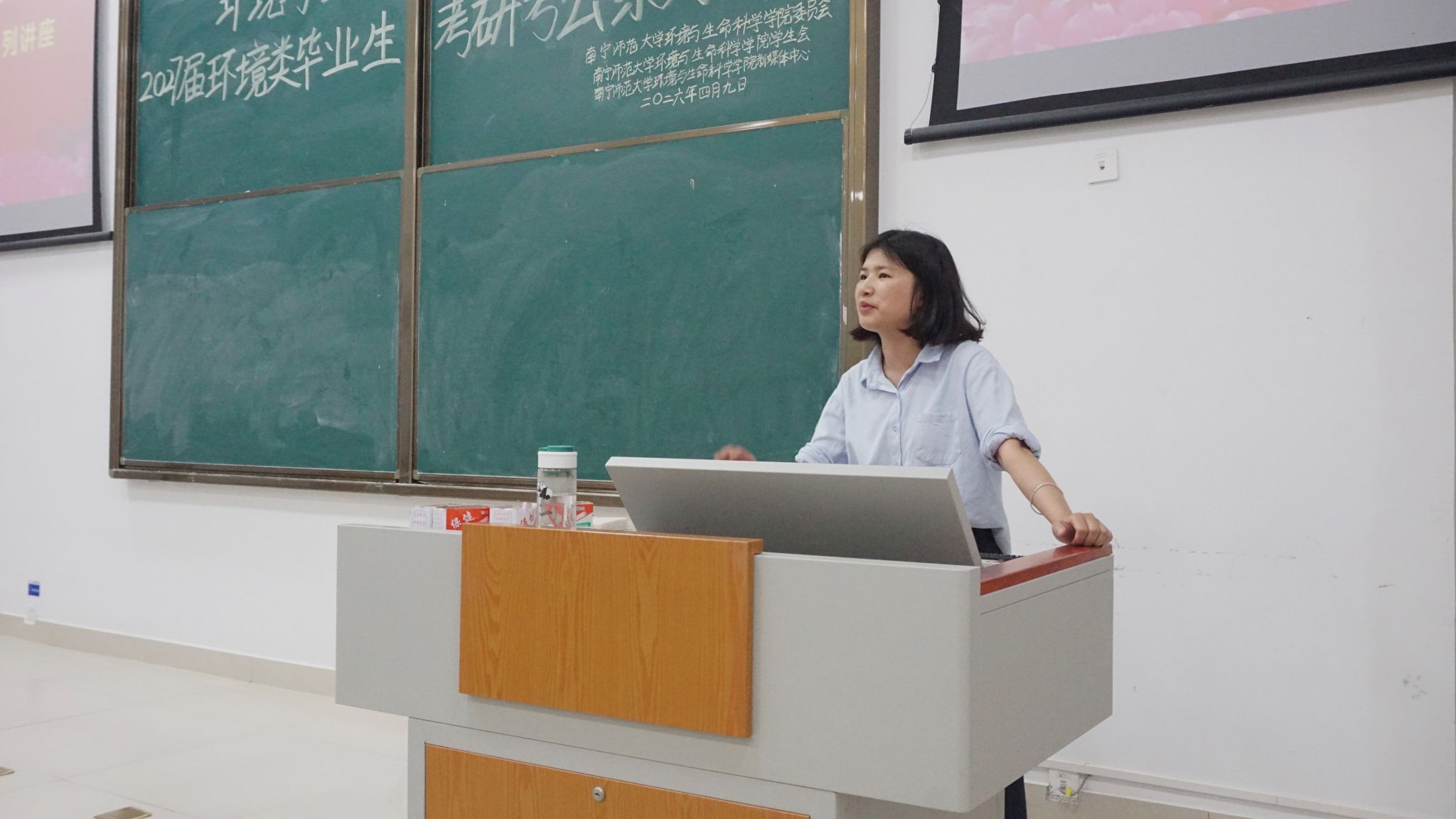 于4月9日晚在武鸣校区地海楼B109教室开展考研考公系列专题讲座。曲炳鹏老师和学院辅导员甘佩萍担任主讲人,为2027届环境类毕业生讲解环境类专业的考研考公方向。