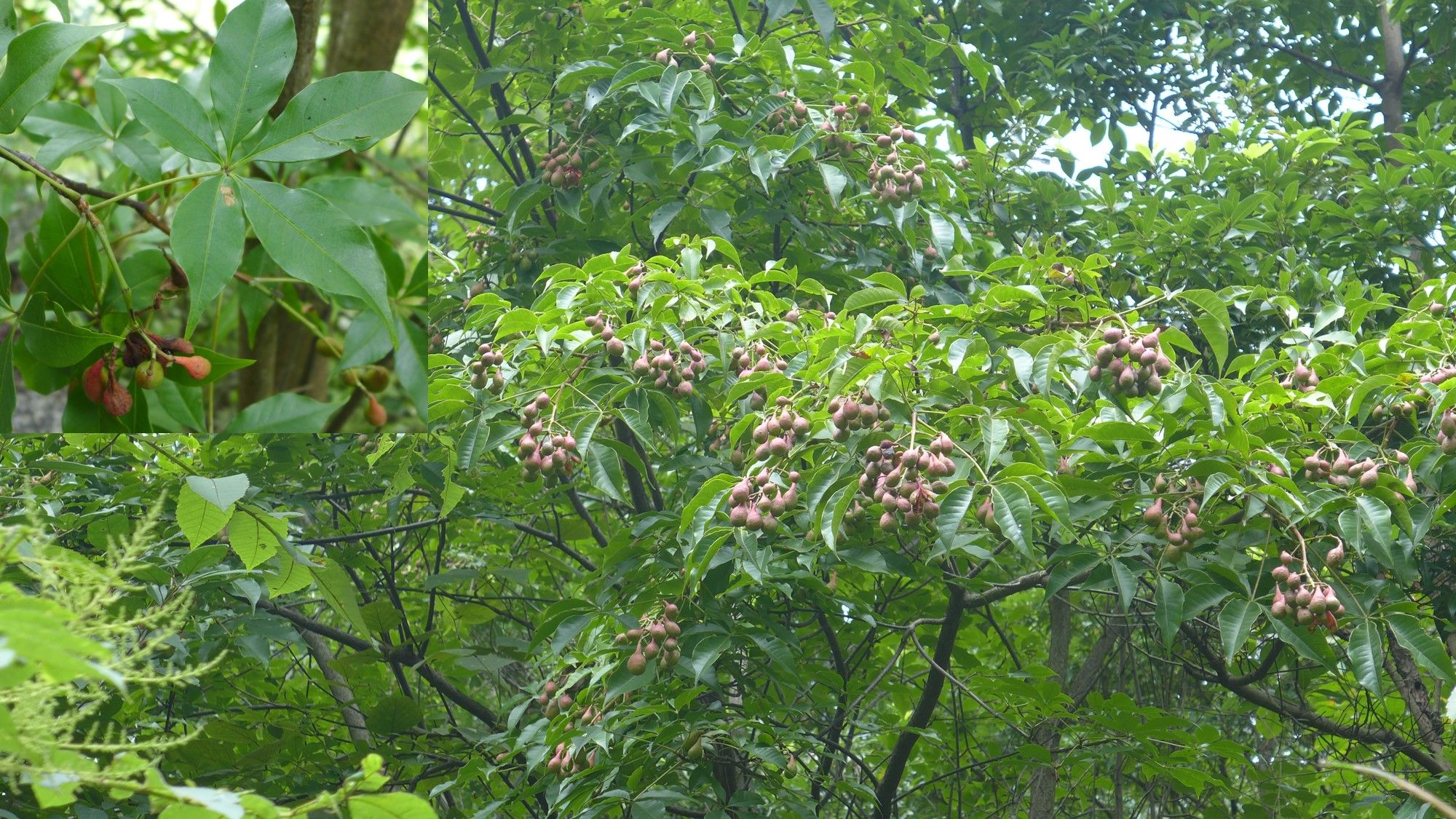叶: 掌状复叶,对生,叶柄长4-11厘米;小叶4或5,薄纸质,椭圆形或倒卵形,长3-12厘米,先端常尾状骤尖,基部宽楔形,两面无毛,下面散生黑色腺点,侧脉10-12对;小叶柄长0.1-1.5毫米;无托叶;