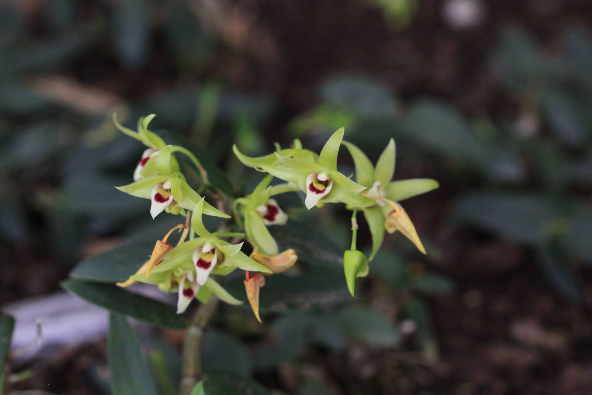 花: 总状花序常从落了叶的老茎上部发出,具2-3朵花;花序柄长5-10毫米,基部具2-3枚短鞘;花序轴回折状弯曲,长2-4厘米;花苞片干膜质,浅白色,卵形,长5-7毫米,先端稍钝;花梗和子房长2-2.5厘米;萼片和花瓣黄绿色,近相似,长圆状披针形,长约1.8厘米,宽4-5毫米,先端锐尖,具5条脉;侧萼片基部较宽阔,宽约1厘米;萼囊圆锥形,长约5毫米,末端圆形;唇瓣白色,基部具1个绿色或黄色的胼胝体,卵状披针形,比萼片稍短,中部反折,先端急尖,不裂或不明显3裂,中部以下两侧具紫红色条纹,边缘多少波状;唇盘密布细乳